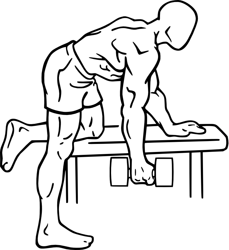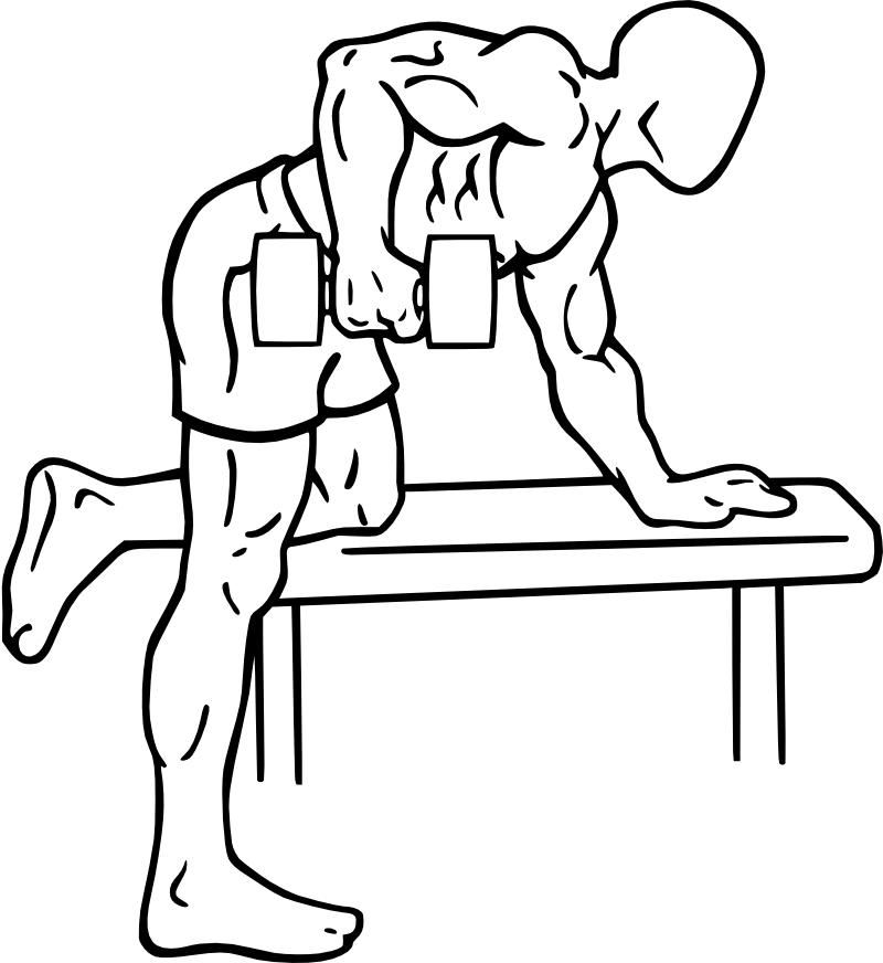 Nehme eine Flachbank und setze das Knie eines Beines auf ein Ende, das andere Bein ist daneben und leicht angewinkelt. Beuge deinen Oberkörper nach vorn und benutze deine Hand um dich abzustützen. Der Rücken macht einen leichten Hohlkreuz. Greife die Hantel mit der freien Hand und hebe sie eng am Körper entlang (achte auf die Ellenbogen). Bringe sie langsam nach unten und wiederhole die Bewegung sobald du unten angekommen bist. Wechsle danach die Seite.