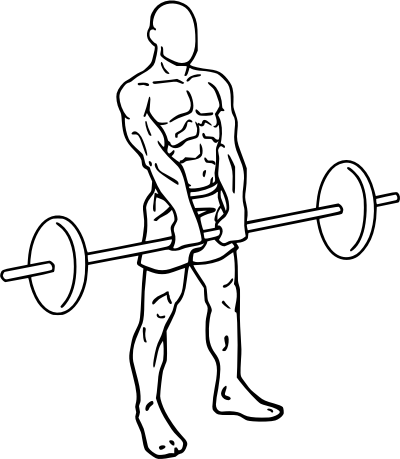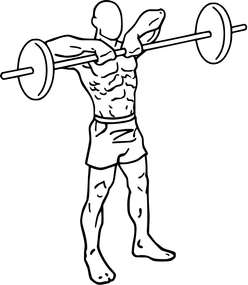 Stelle dich gerade hin, die Füße etwa schulterbreit. Halte die ß-Stange mit einem Obergriff vor den Oberschenkel, die Arme ausgestreckt. Ziehe dann die Stange dicht am Körper hoch, bis etwa zum Kinn. Die Ellenbogen zeigen nach oben, so, dass in der höchsten Position die Arme ein leichtes V machen. Mache nach Möglichkeit hier eine kurze Pause und gehe dann langsam wieder runter.