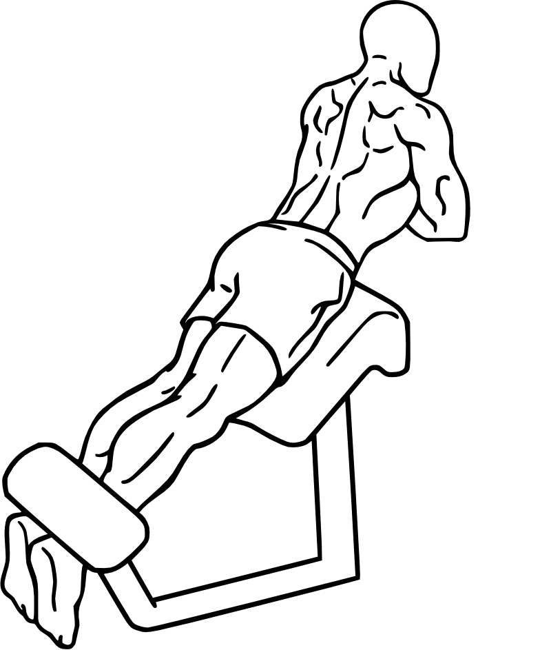 Lay on the hyperextension pad with the belly button just at the leading edge, the upper body can hang freely. Tense your whole back's muscles and bring your upper body up till it is horizontal, but not more. Go slowly down and don't relax your muscles.