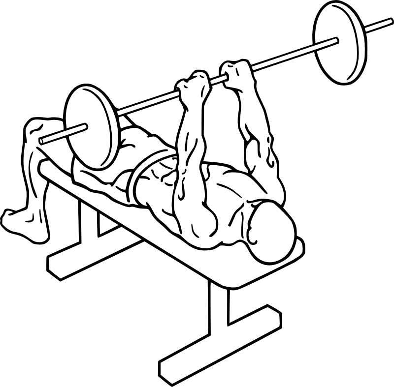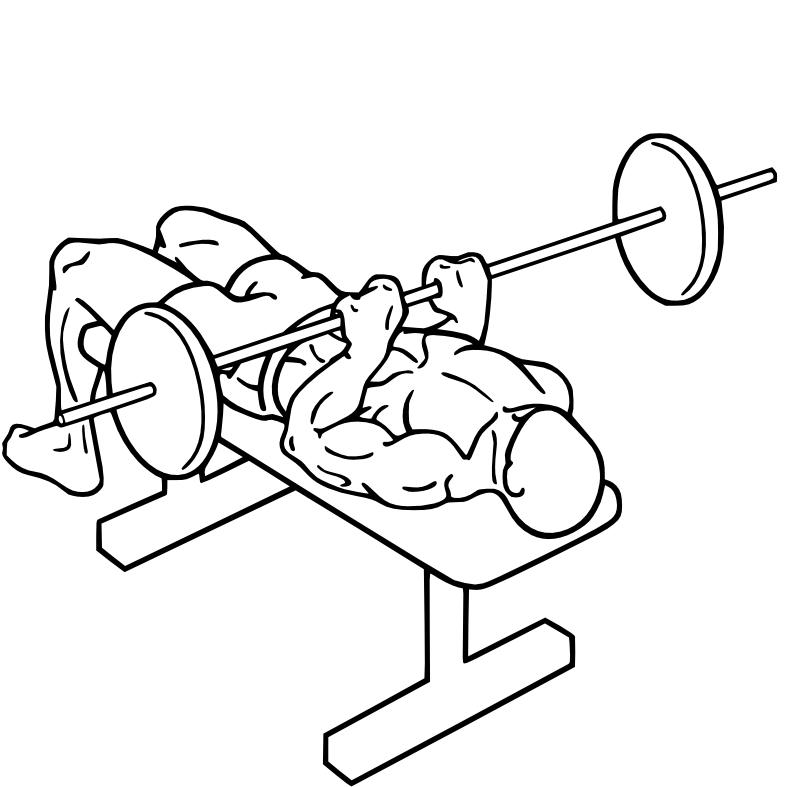 Lay down on a bench, the bar is directly over your eyes, the knees form a slight angle and the feet are firmly on the ground. Hold the bar with a narrow grip (around 20cm.). Lead the weight slowly down till the arms are parallel to the floor (elbow: right angle), press then the bar up. When bringing the bar down, don't let it down on your nipples as with the regular bench pressing, but somewhat lower.