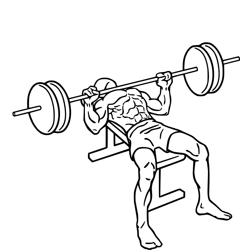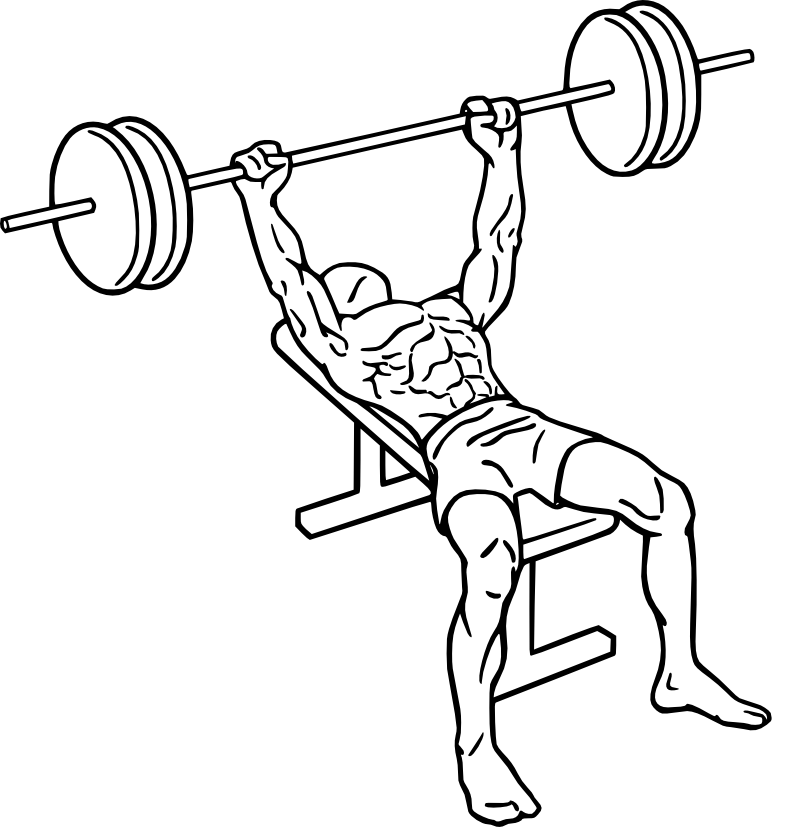 Lay down on a bench, the bar should be directly above your eyes, the knees are somewhat angled and the feet are firmly on the floor. Concentrate, breath deeply and grab the bar more than shoulder wide. Bring it slowly down till it briefly touches your chest at the height of your nipples. Push the bar up.